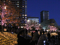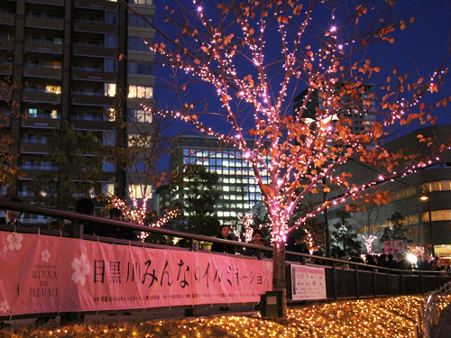 11月29日(金)、区立五反田ふれあい水辺広場(東五反田2-9)で、サクラ色のLED電球が目黒川沿道を彩る「目黒川みんなのイルミネーション2013」の点灯式が行われました。