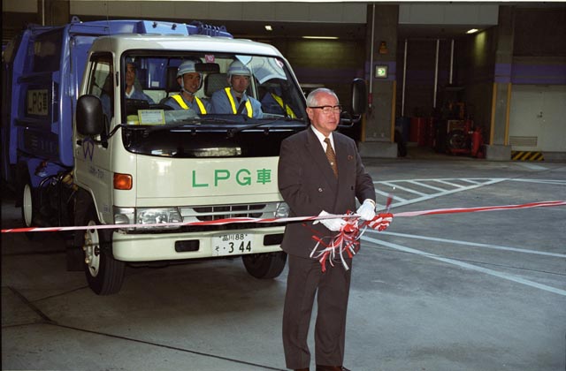 基礎的自治体としてスタート。清掃事業等が都から区に移管 ID 3336 撮影年月日 2000年(平成12年) 4月 1日 撮影場所 品川清掃事務所(大崎1丁目) 内容 ゴミ収集車の前で高橋久二区長がテープカット