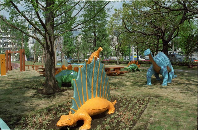 恐竜の遊具と公園全景