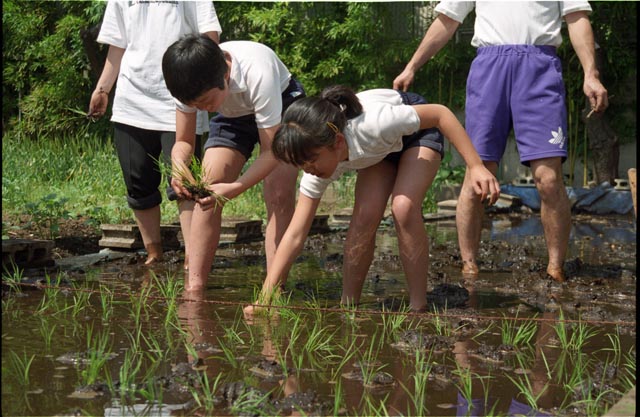 田植えをする生徒たち