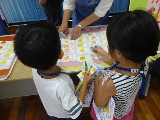 おかいものゲームは2回挑戦し、2回目は交換したいものを班のお友達と一緒にお店屋さんに交換しに行きました。