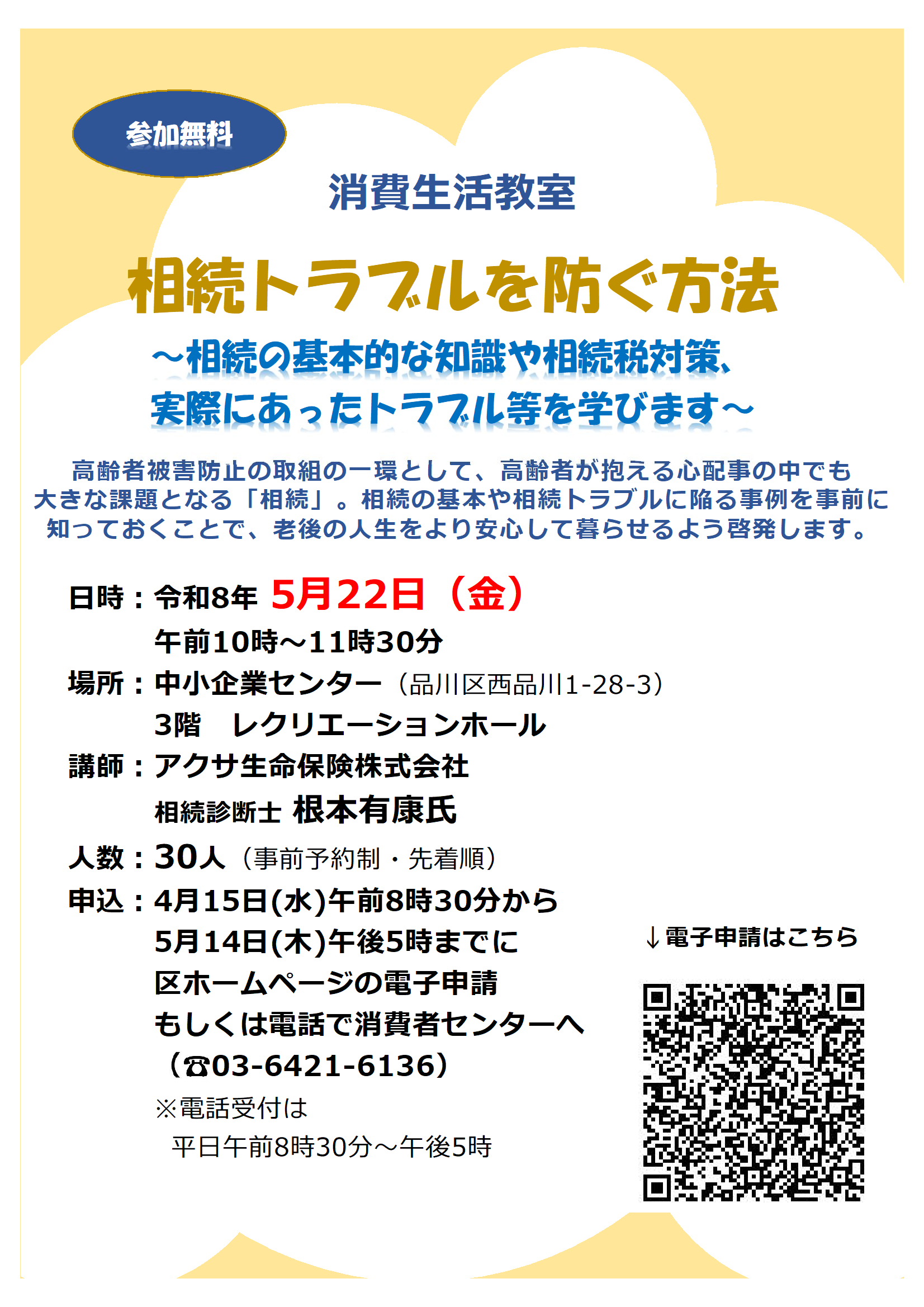 | 申込方法 | 「品川区電子申請サービス」もしくは電話で消費者センターへ ※電話受付は平日午前8時30分から午後5時00分(土日祝除く) 03-6421-6136 ※定員に達した時点で受付終了となります。 品川区電子申請サービスはこちら(別ウィンドウ表示) |