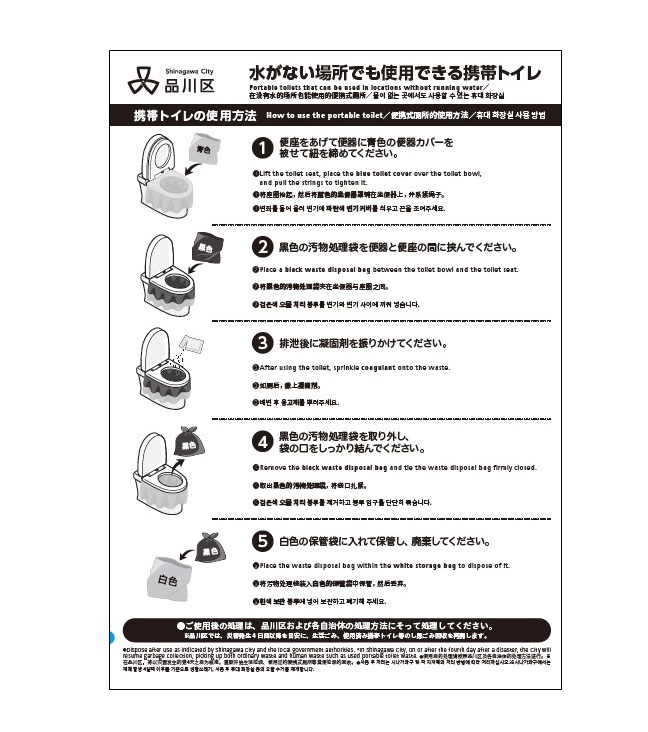 携帯トイレ 1人20回分(汚物処理袋(黒)10枚が2セット、保管袋(白)4枚、便器カバー(青)1枚、凝固剤20包)改訂版しながわ防災ハンドブックを1世帯1冊同封しています。
