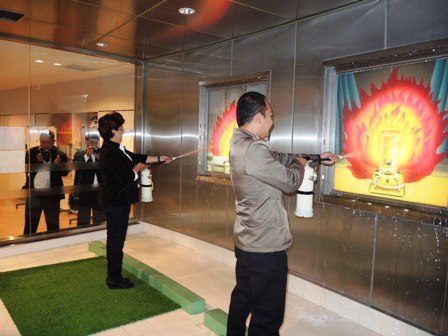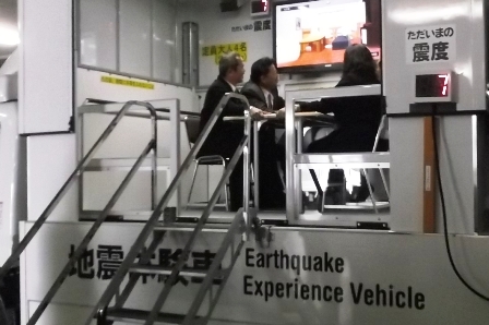 2階の品川シアターで挨拶を交わした後3班に分かれた参加者は、それぞれの順番に従って、3D映画「地震・その時あなたは」で地震を疑似体験、模擬消火器を使って初期消火の仕方を学び、地震体験車に乗って震度7までの地震の揺れを体験しました。