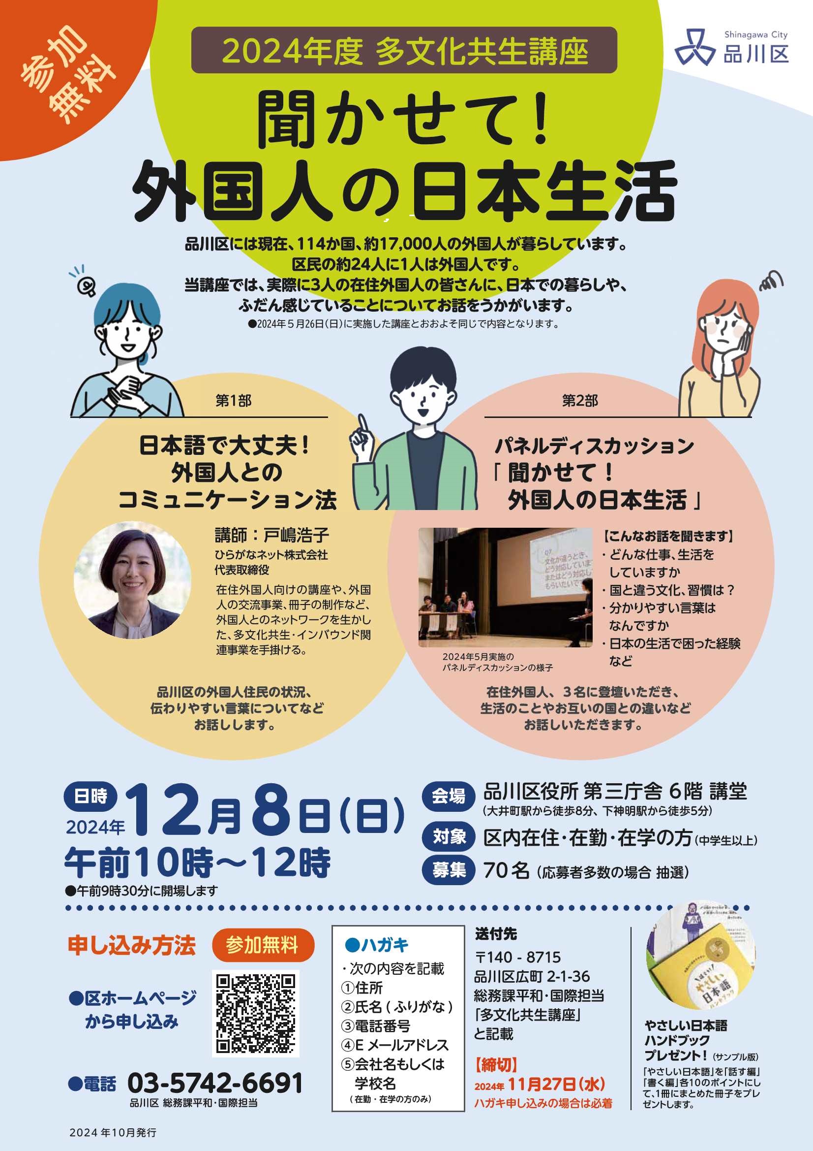 はがきに「多文化共生講座」と以下の項目を記入し、品川区役所総務課平和・国際担当(〒140-8715 品川区広町2-1-36)にお送りください。- 住所