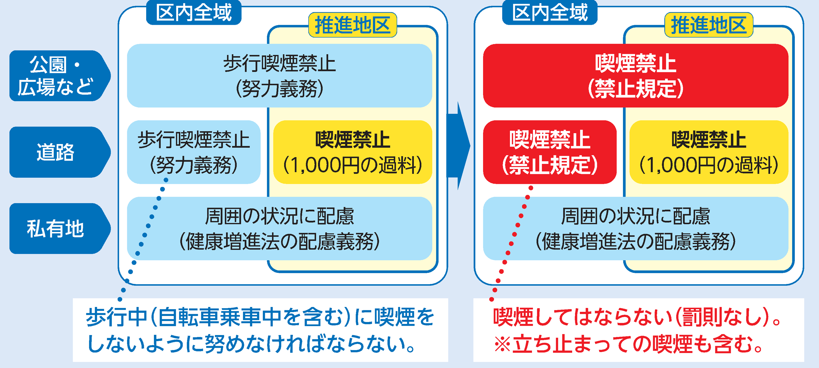 - 規制の強化は段階的に行うのが望ましく、また、公衆喫煙場所の整備状況などを踏まえますと、まずは、区内全域の公共の場所における歩行喫煙禁止(努力義務)を喫煙禁止(罰則なしの禁止規定)とすることしました。