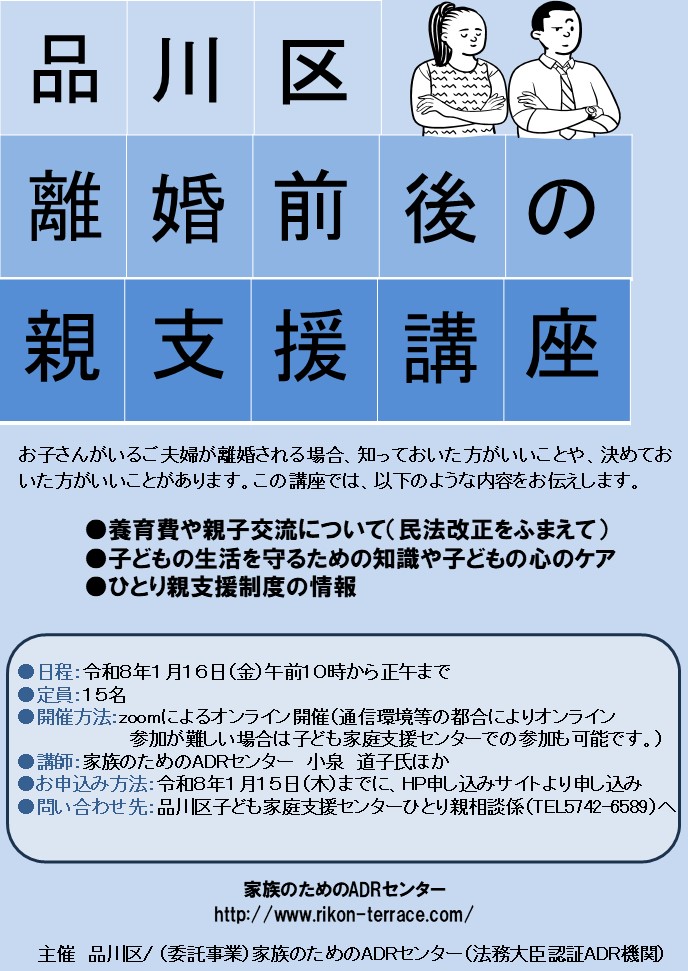 トップページ > 子ども・教育 > 家庭相談・ひとり親家庭支援 > 品川区 離婚前後の親支援講座