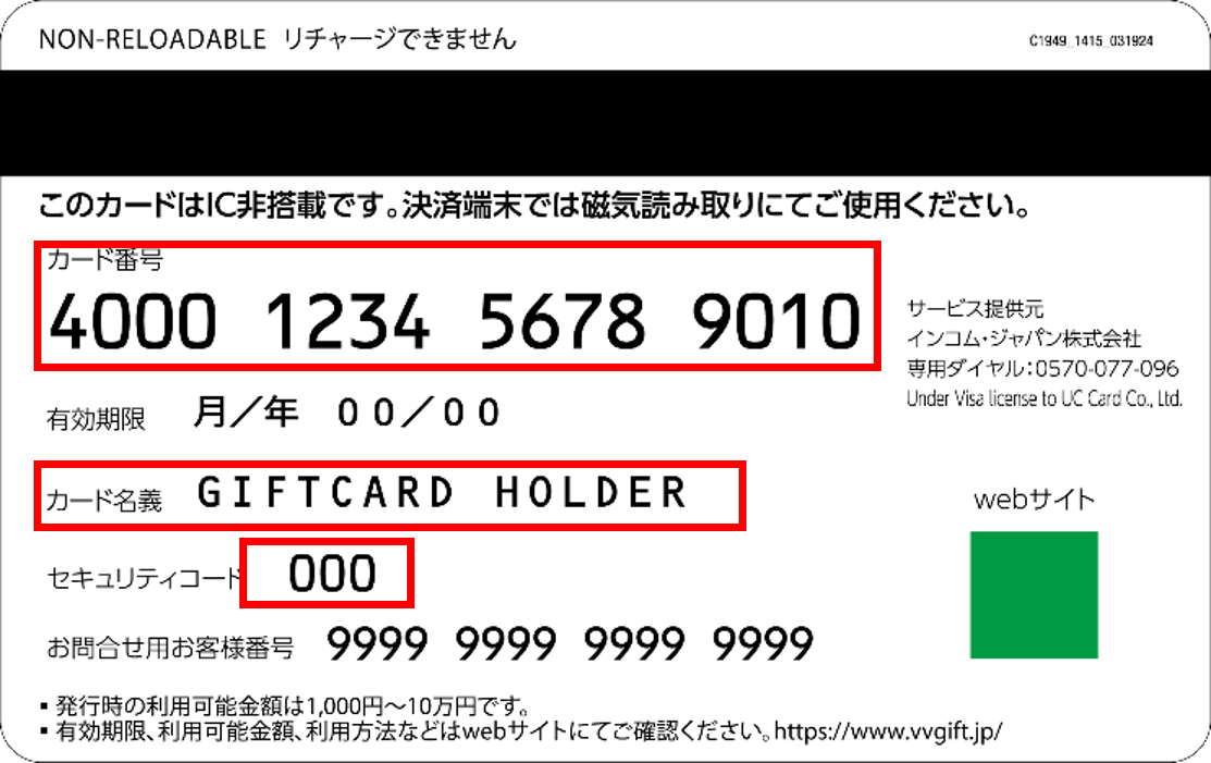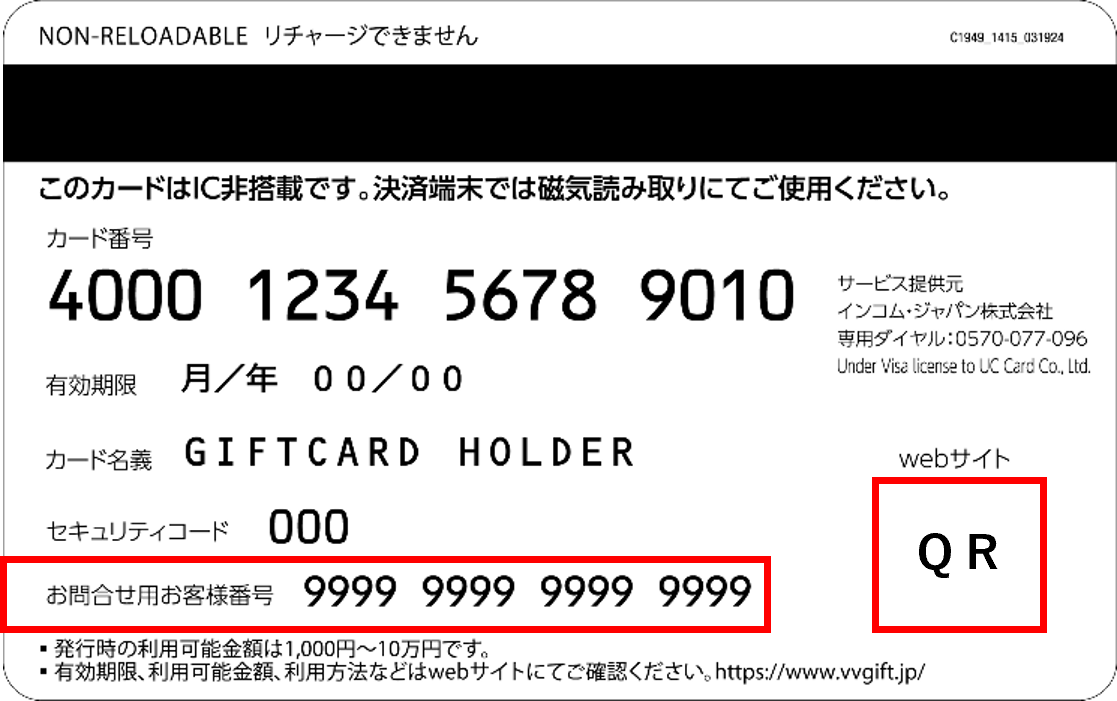 - カード裏面の「お問い合わせ用お客様番号」をご確認のうえ、0570-077-096(バニラVisaギフト専用ダイヤル)へお電話ください。