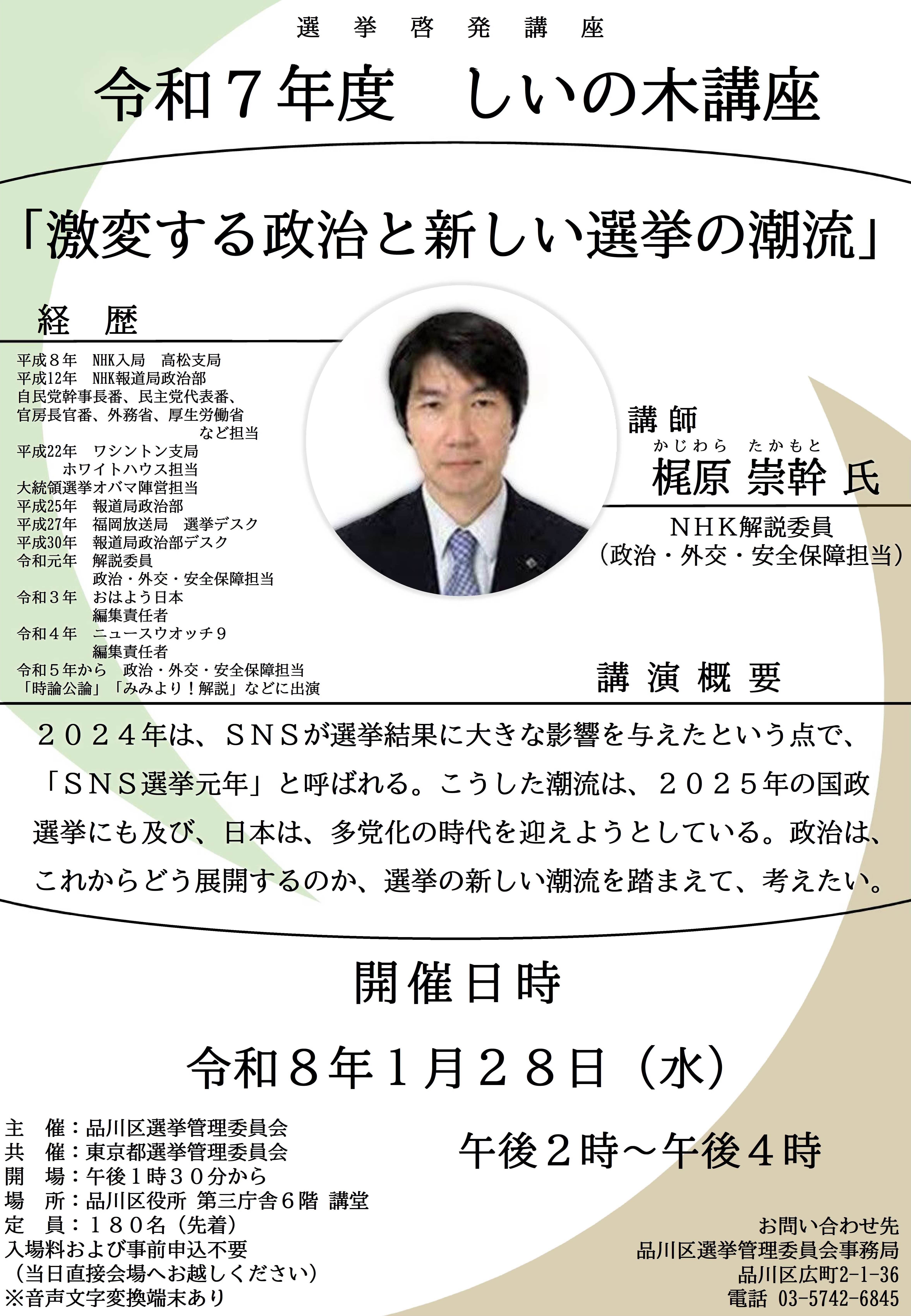 品川区選挙管理委員会では選挙啓発を目的として、広く区民を対象とした選挙啓発講座を開催しています。