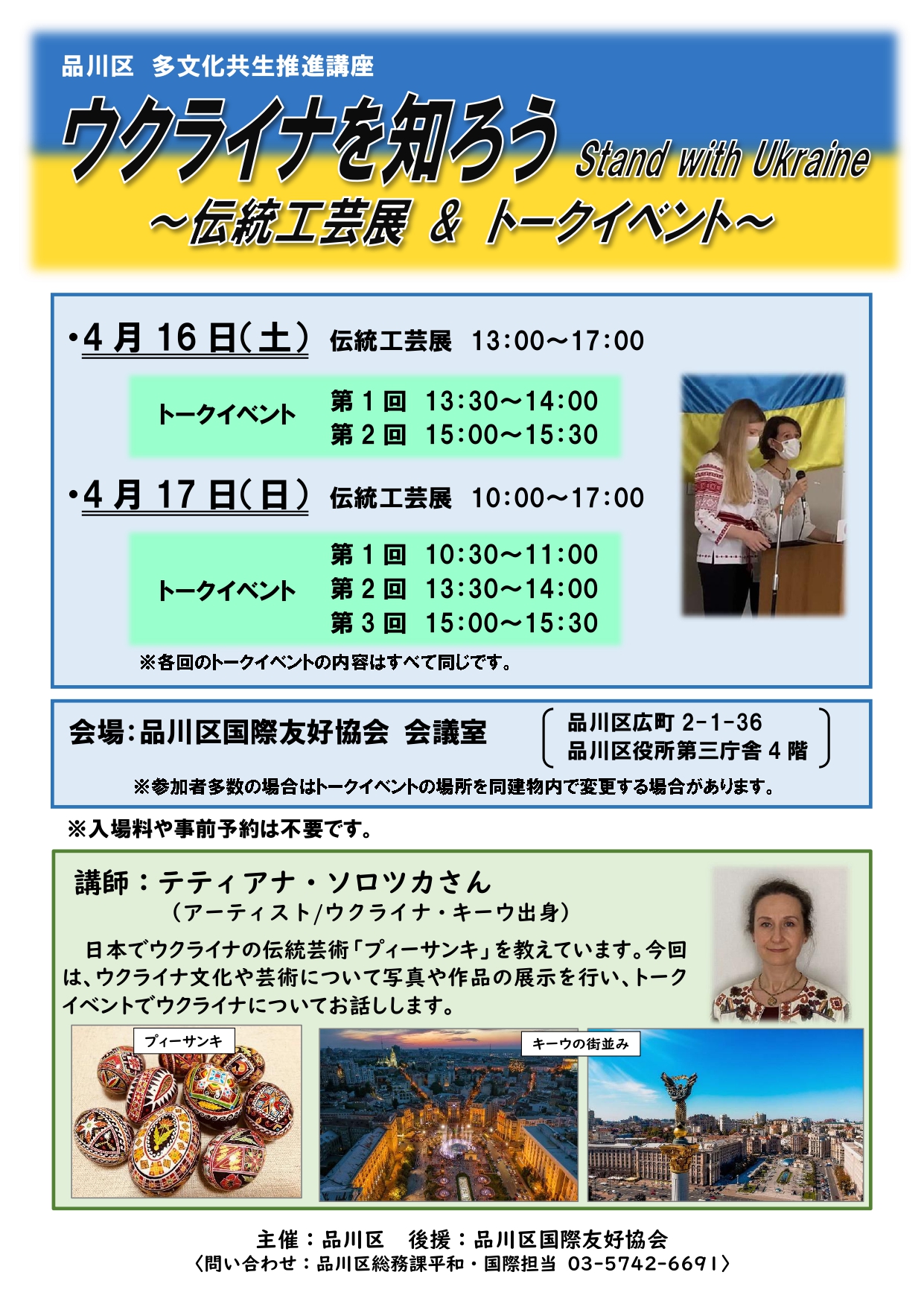 ウクライナ出身で日本在住のアーティスト テティアナ・ソロツカさんを講師にお招きして、ウクライナの文化や芸術についてのトークイベントを行いました。あわせて写真や伝統工芸品などを展示しました。(入場料は無料、予約不要)