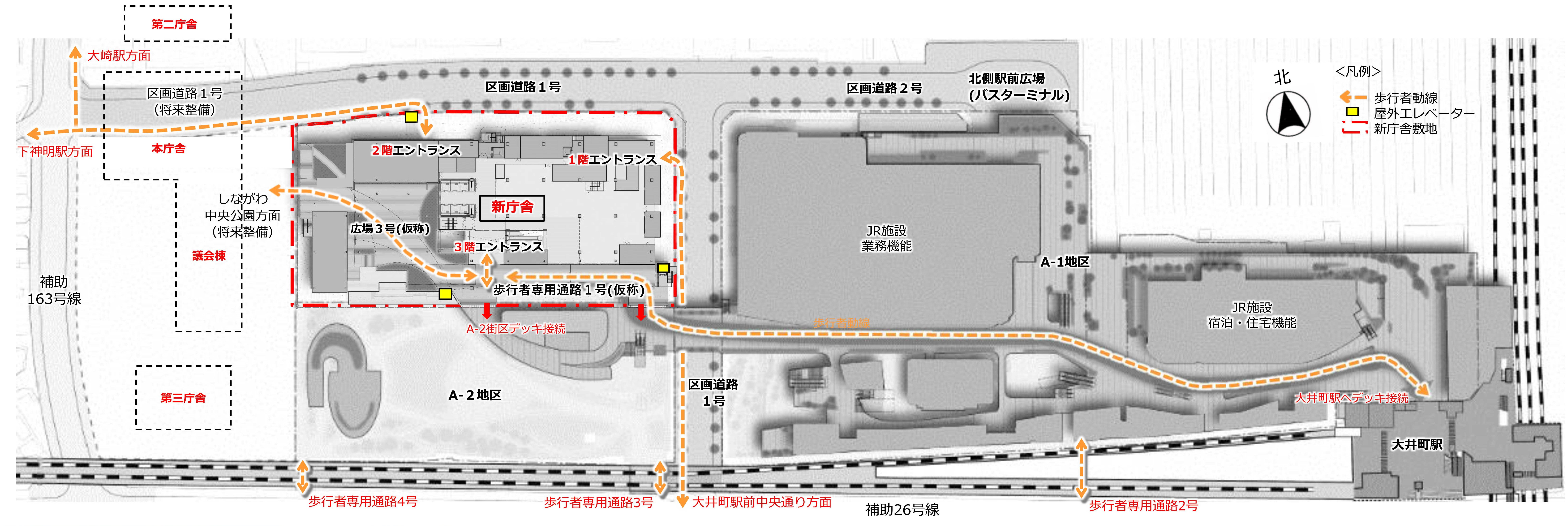 ・歩行者専用通路1号は、デッキにより大井町駅から新庁舎、将来的にはしながわ中央公園方面へ接続します。