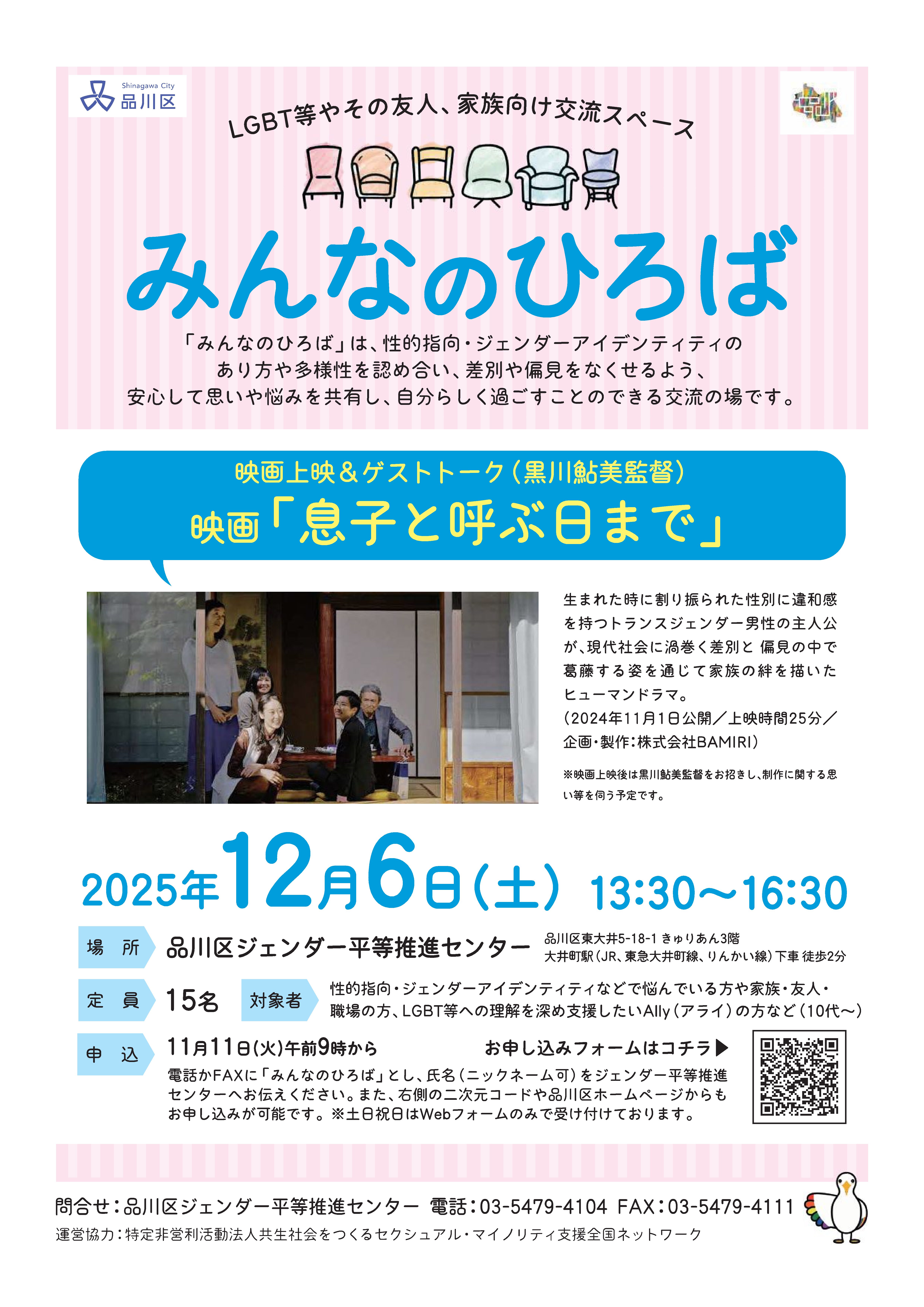 LGBT等やその友人、家族向け交流スペース 「みんなのひろば」(年4回実施) ・映画上映「息子と呼ぶ日まで」 ・黒川鮎美監督によるゲストトーク ご自身の生き方について考えてみたい方、多様な人を尊重する社会づくりに関心がある方など、皆様のご参加をお待ちしています。 |