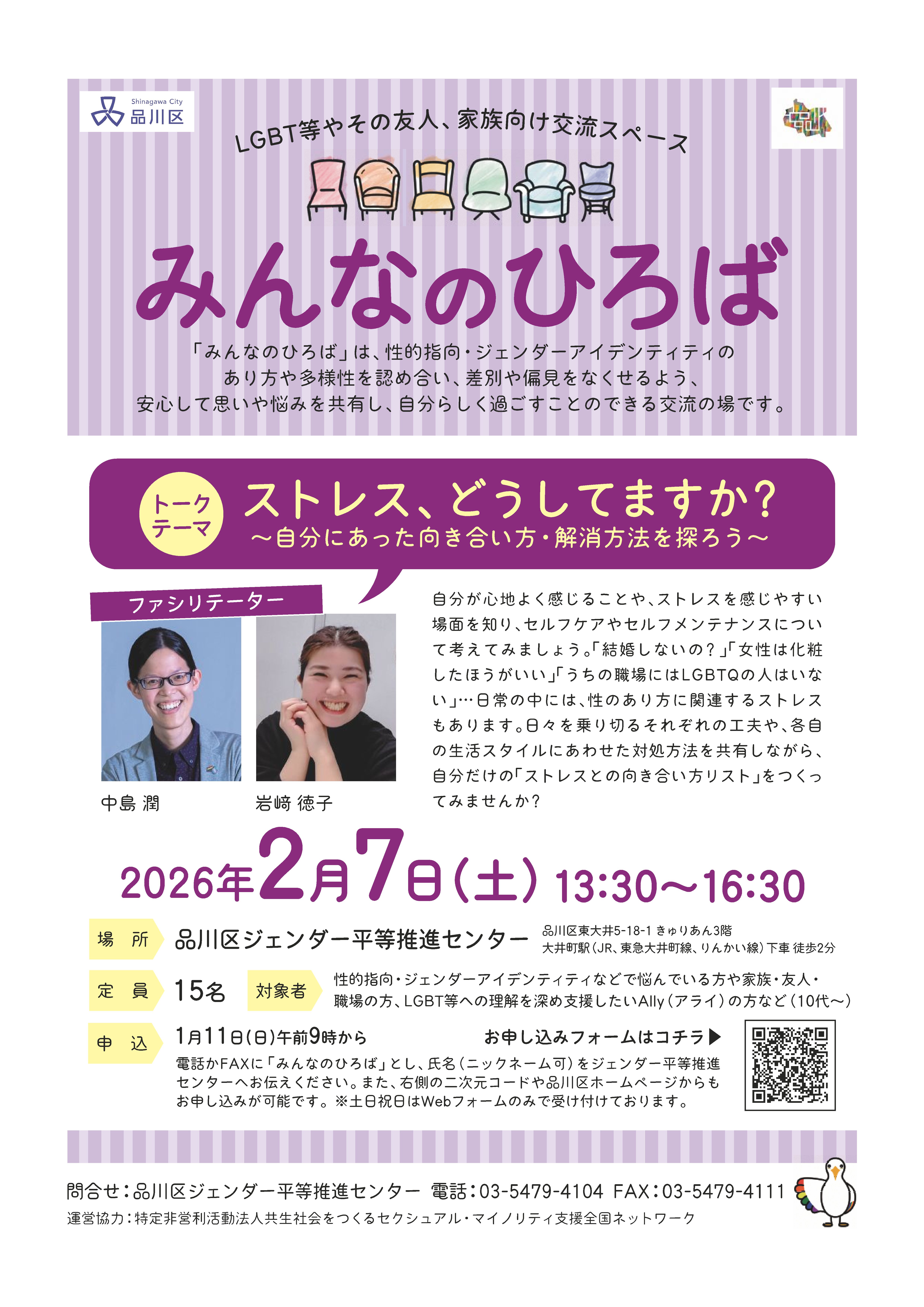LGBT等やその友人、家族向け交流スペース 「みんなのひろば」(年4回実施・第4回) テーマトーク「ストレス、どうしてますか?~自分にあった向き合い方、解消方法を探ろう~」 ご自身の生き方について考えてみたい方、多様な人を尊重する社会づくりに関心がある方など、皆様のご参加をお待ちしています。 |