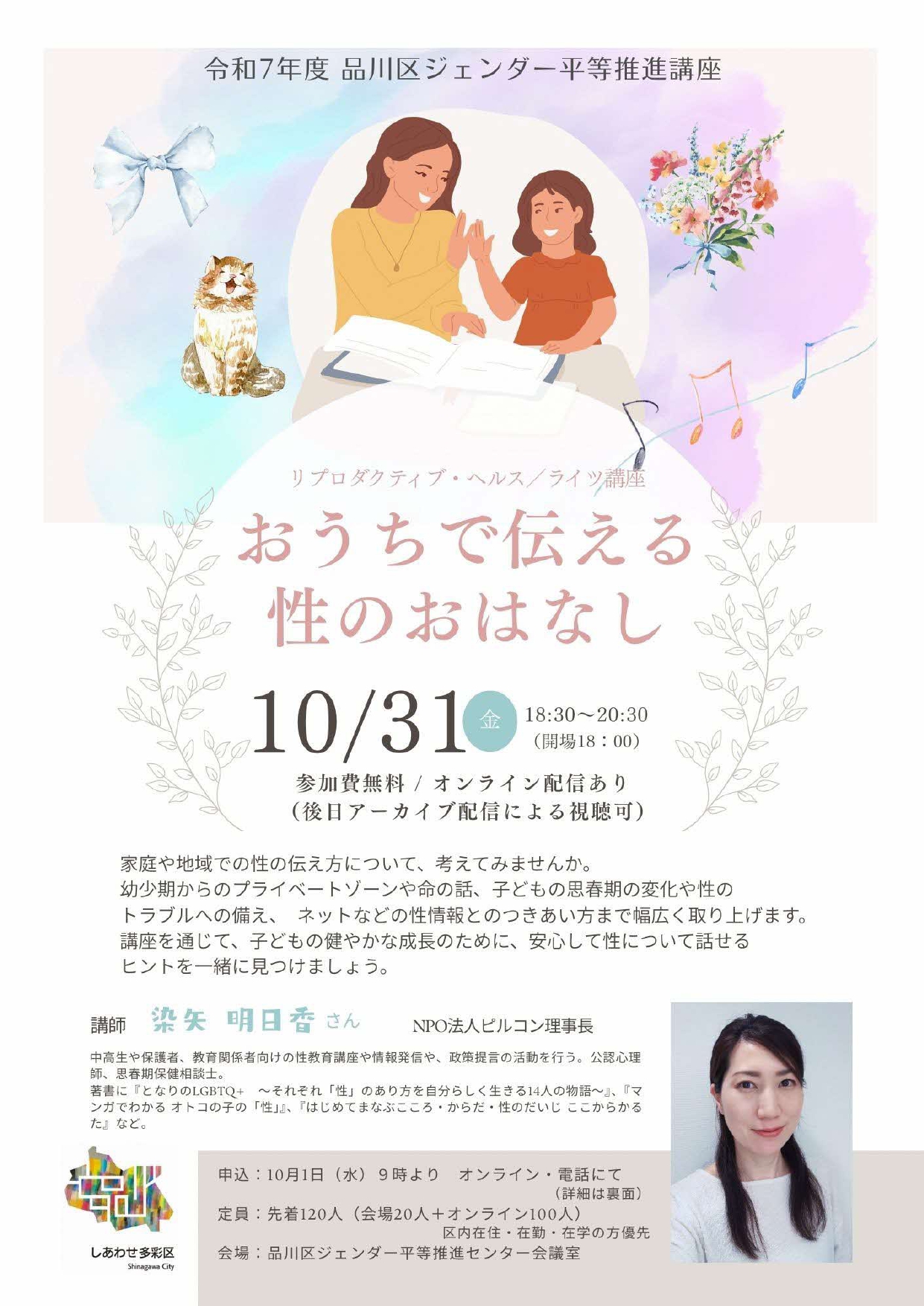 リプロダクティブ・ヘルス/ライツ講座 「おうちで伝える性のおはなし」 家庭や地域での性の伝え方について、考えてみませんか。 幼少期からのプライベートゾーンや命の話、子どもの思春期の変化や性のトラブルへの備え、 ネットなどの性情報とのつきあい方まで幅広く取り上げます。 講座を通じて、子どもの健やかな成長のために、安心して性について話せるヒントを一緒に見つけましょう。 【講師】染谷 明日香氏(NPO法人ピルコン理事長) |