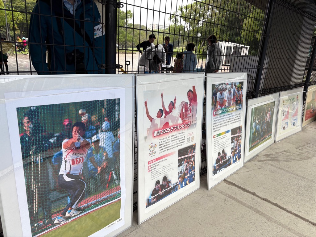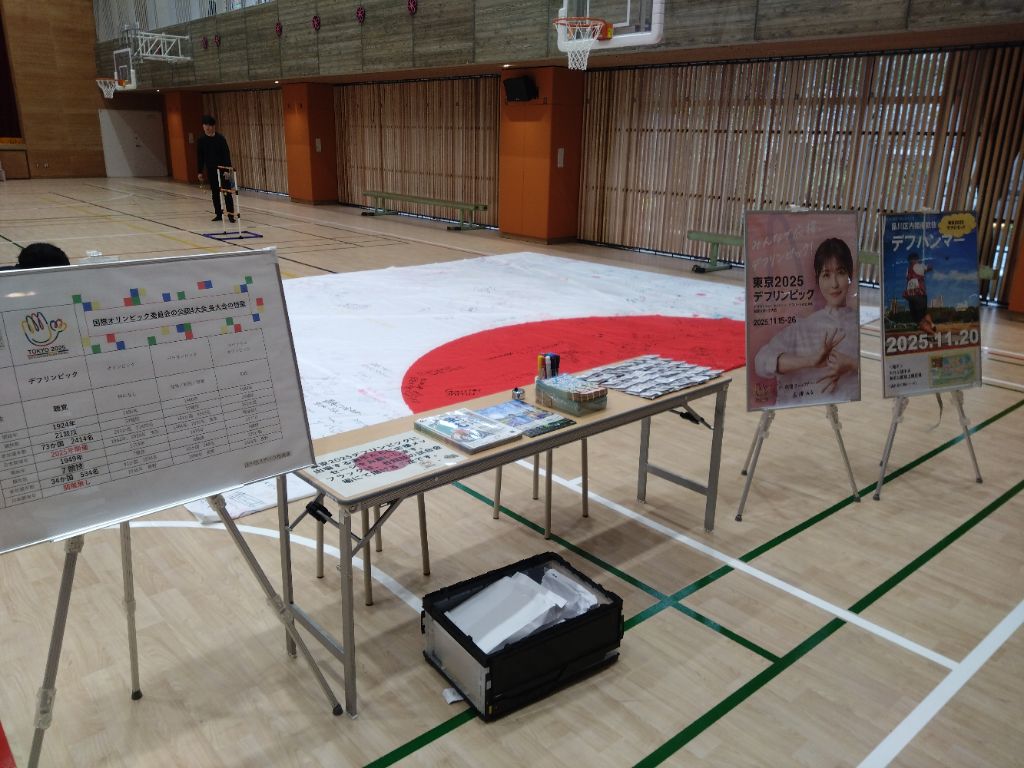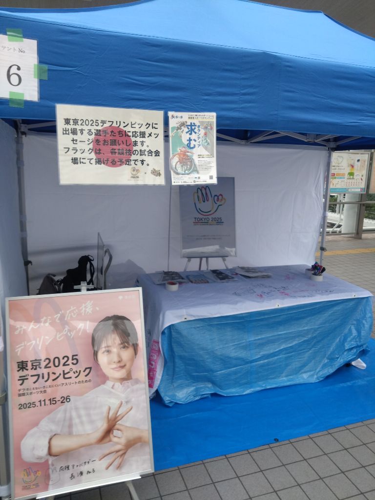 令和7年6月29日(日)にしながわ中央公園多目的広場で開催された「ブラインドサッカー東日本リーグ2025」にて、デフリンピック啓発ブースを出店しました。来場者へ向けた、パネル展示やチラシ配布のほか、デフサッカーとデフハンマーの応援フラッグ(日本国旗)に応援メッセージを書いていただきました。