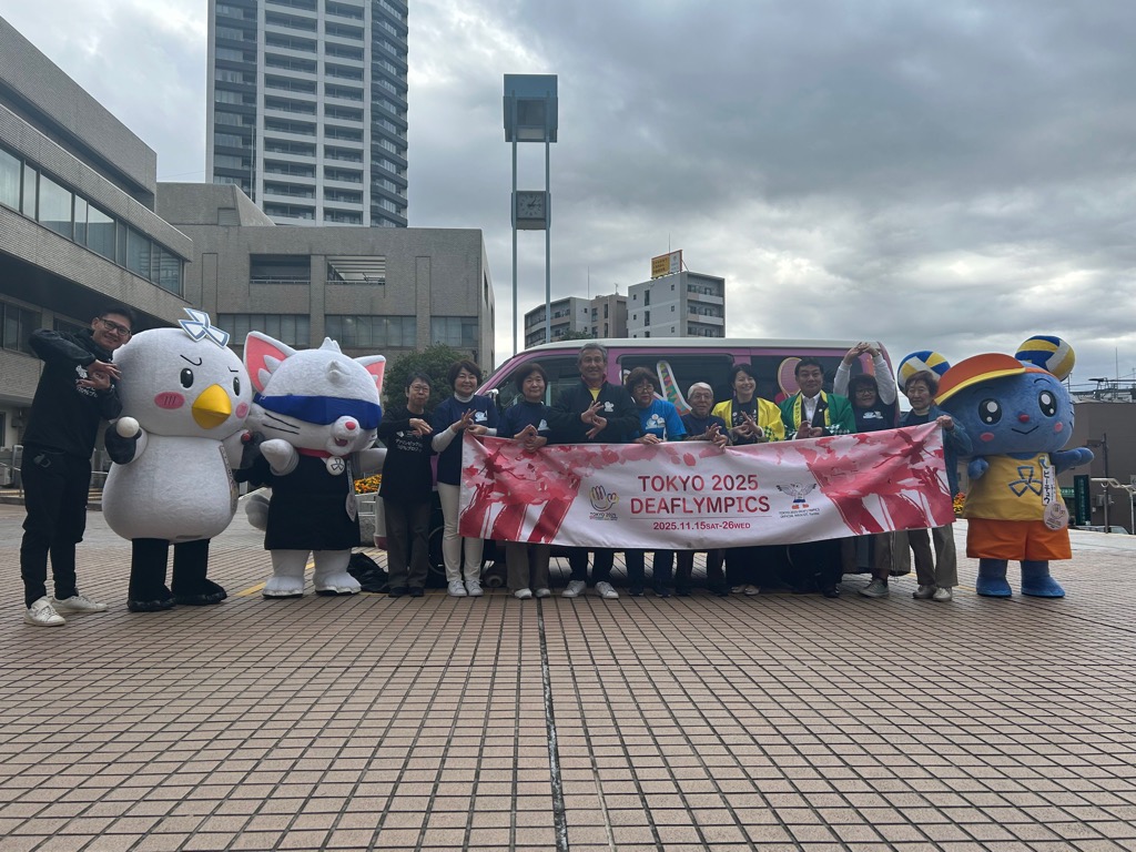 令和7年11月11日(火)に、東京2025デフリンピックの周知・啓発を目的に全国を巡っていたキャラバンカーが品川区役所に到着しました。当日は、品川区聴覚障害者協会や区民の皆さん、区の職員などでお出迎えをし、品川区公式デフリンピックサポーターの植松隼人さんにはサインエールのレクチャーをしていただきました。