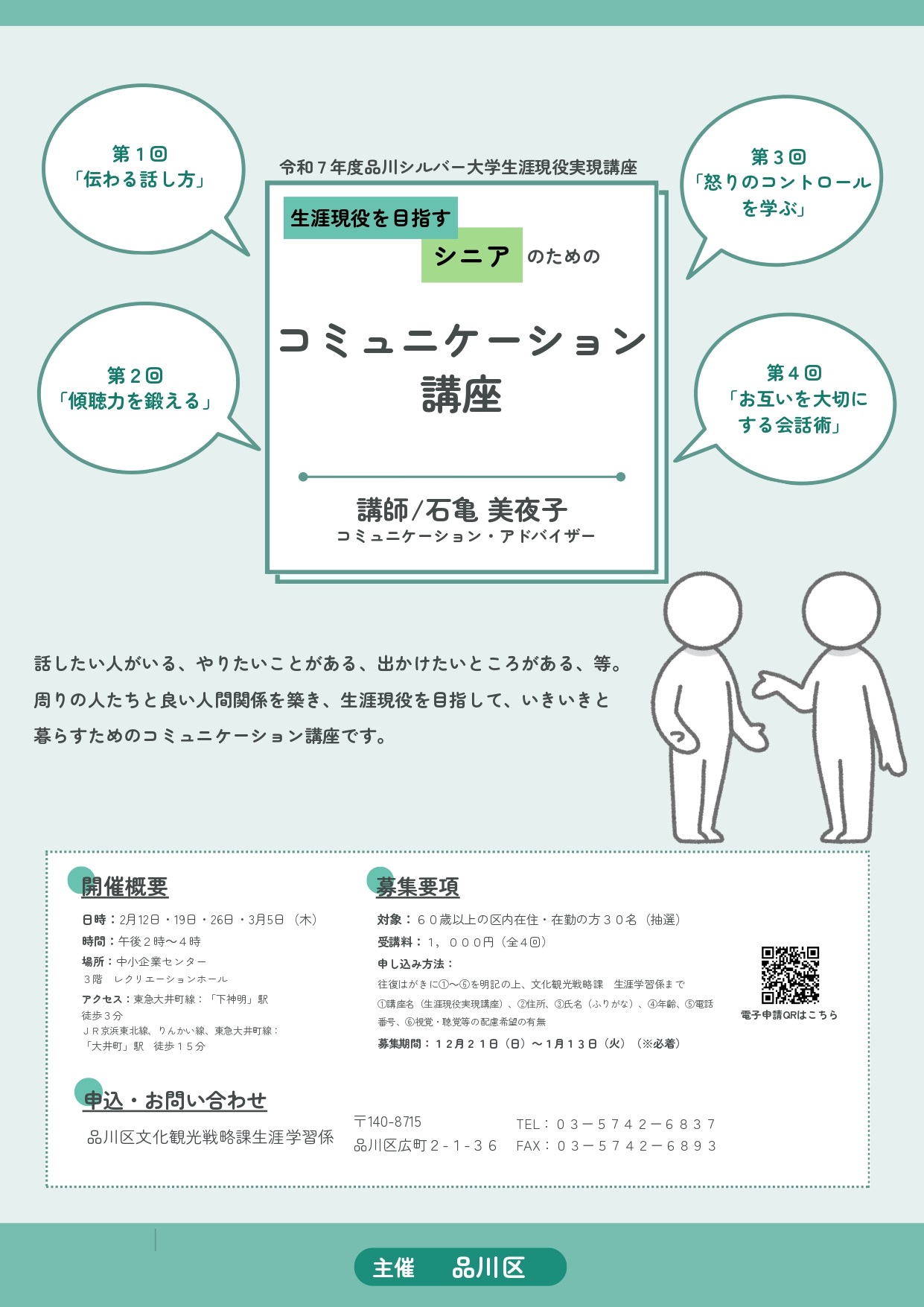 品川シルバー大学生涯現役実現講座「生涯現役を目指すシニアのためのコミュニケーション講座」(2月12日~3月5日実施)