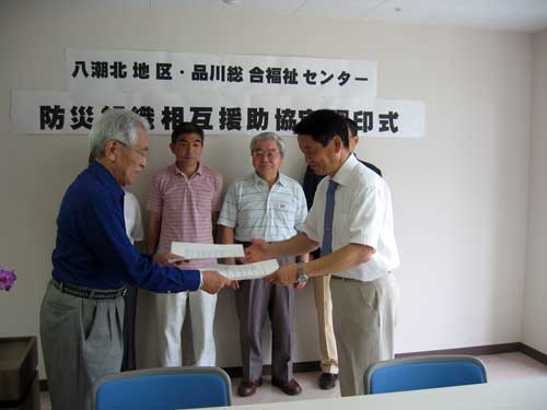 6月30日(土)、社会福祉法人 品川総合福祉センター(島田勇理事長)において、総合福祉センターとセンターに隣接する八潮北地区の3自治会の間で、地震や火災などが発生した際に、人命の安全確保と被害拡大防止のために相互協力することを目的とした防災組織相互援助協定を締結しました。