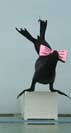 ホワイトデー・アシカショーは、まずクッキーがフラフープやボールを使って器用な芸を披露。その後、いったん舞台裏に姿を消し、大きなピンクのリボンを頭につけてもらい再登場します。突然の「変身」に、客席からは「かわいい!」の声があがりました。アナウンスの「似・合・う・で・しょ?」のフレーズにあわせ、首を振ったり、台の上で倒立してみたりと、プレゼントにご機嫌のようす。最後は、トレーナーのお兄さんと一緒に、手を振って締めくくりました。