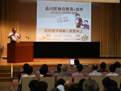 9月10日、シルバー大学の後期が開校し、濱野健区長が「しながわの明日を創る」というテーマで講義をしました。