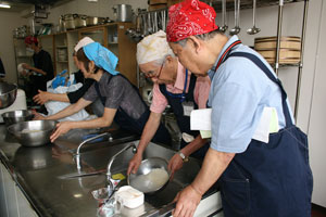 まずはご飯です。初めてご飯を炊く参加者もいて、講師から分量の量り方、研ぎ方を教わります。
