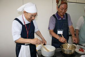 今回最高齢の参加者は94歳の男性。「普段は娘に料理を作ってもらっているが、娘の負担を軽くするために料理を始めようと思った」と話し、ピーマンの千切りに挑戦しました。料理は初めてということだったが、手際よく包丁を使い、「初めてにしてはうまい」と誉められていました。他の参加者は「定年になり、時間に余裕ができたので料理に興味を持った。」「妻に教室を勧められて参加した」などと話していました。