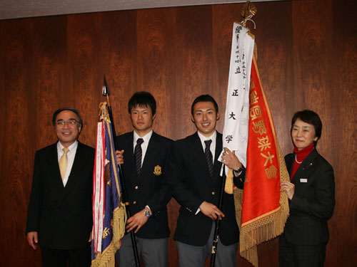この日は高村弘毅学長、伊藤由紀夫監督、椎名亮介主将(3年)ら大学関係者7人が区役所を訪れ、創部61年目の快進撃を報告。高村学長は「暗い話題が多い中で、明るいニュースを届けられてよかったと思います」と笑顔であいさつし、2本の優勝旗を目の前にした濱野区長は「素晴しい成績で品川区の誇りです。精進してさらに強くなっていただきたい」と話しました。