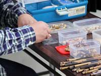 4階では、品川区伝統工芸保存会「和竿」の大石稔さん、とんぼ玉作家の大野裕子さん、七宝焼き作家の原雅恵さんを特別指導員に迎え、和竿の作成工程の展示や竹ストラップ作り、とんぼ玉や七宝焼きの製作コーナーをはじめ、ガラスサンダー、陶芸、革工芸、型染めによる絵はがきやかばん製作、プラバン、木工パズルのコーナーや都立高専の皆さんの協力によるロボットサッカーなどのコーナーがありました。