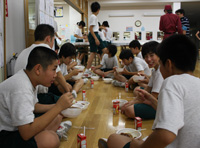 児童・生徒たちは金曜日の授業終了後、一旦帰宅した後に再登校し、炊き出し訓練や校内宿泊の準備などを行いました。夕食は、アルファ化米で作ったカレーライスを、5年生と8年生がグループごとに輪になって、仲良く一緒に食べました。