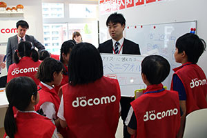 今回から新たに生命保険会社、新聞社、携帯電話事業社の3業種がこの仮想店舗に参加することとなり、授業が始まる前にテープカットの式典が行われました。式典の冒頭、教育委員会事務局の村尾教育総合支援センター長は子供たちに「今日は社会の仕組みを知り、学校では経験できない事をたくさん体験できます。いっぱい失敗してください。そして、いろいろな事をたくさん学んでください」とあいさつしました。