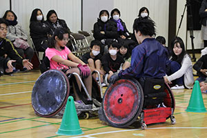 周遊コースを回ってホッとすると、最後に講師からタックルの洗礼です。タックルこそウィルチェアラグビーの醍醐味で、タックルにはまり競技を辞められない選手もいるとのことです。児童がOKサインを出すと、講師が正面からぶつかって来ます。手加減をしているものの「ガシーン」と金属音が体育館に響きました。タックルを受けた児童は、「ちょっと怖かったけど、衝突しても身体が痛くなることはなかった」と話していました。