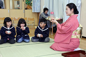 お茶会は洋室の一部に畳を敷き会場とし、「さくらさくら」や「お江戸日本橋」等の琴の音をBGMに流し、日本的な雰囲気を醸し出し進められました。大多数の園児にとって、お茶会体験は初めてとあって、緊張感が漂います。講師を務めたのは、公益財団法人三徳庵が運営する、大日本茶道学会教授の宮寺陽子さんです。