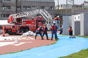 初めての開催地となるしながわ中央公園多目的広場は、今年1月に防災機能を備えてオープンした公園で、100トンの防火水槽2基などが設置されています。震災などの緊急時にはヘリコプターが離着陸できる大きな広場で、溺者の救助、積土のう工法の実施、排水活動などの訓練に取り組みました。
