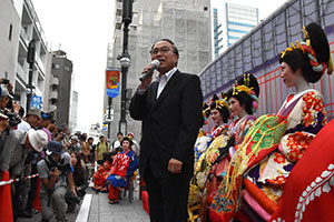 今年の花魁の中には、初の海外出身者・シンガポール出身のリン・レイチェルさんの姿もあり、区内在住でアメリカ出身の肩持ちに手を添え、沿道でカメラを構える観光客ににこやかに微笑みかけていました。