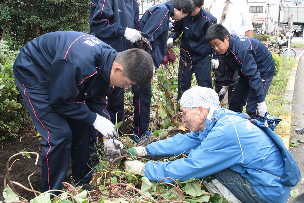 五反田駅前で日野学園の生徒がサツマイモの収穫