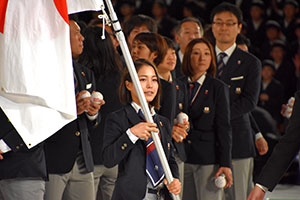 この壮行会は、日本オリンピック委員会(JOC)が主催する「第23回オリンピック冬季競技大会」に出場する日本代表選手団の活躍を願う応援イベント「冬を、燃やせ。とどけ!勇気2018」。城南小学校の6年生14人は、観客約5,000人が見守る中プラカードを持ち、選手95人と大会本部員らを先導しました。