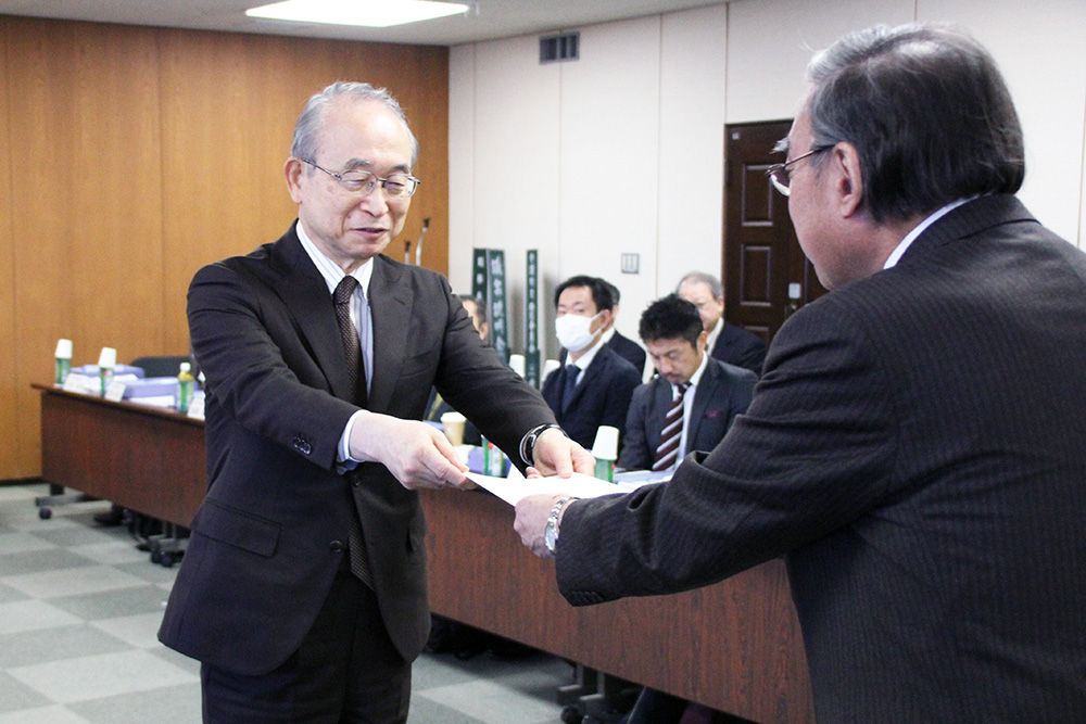 第1回目の開催となったこの日 濱野区長が、同委員会の委員長を務める元東京都副知事の青山佾氏(都市調査会代表)に諮問文を手交しました。今後、8回の策定委員会とパブリックコメントなどを経て、12月に幅広い意見を反映させた計画素案を答申する予定です。