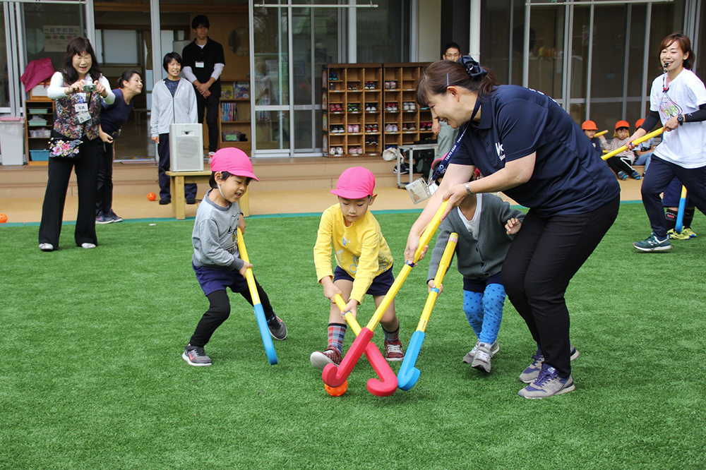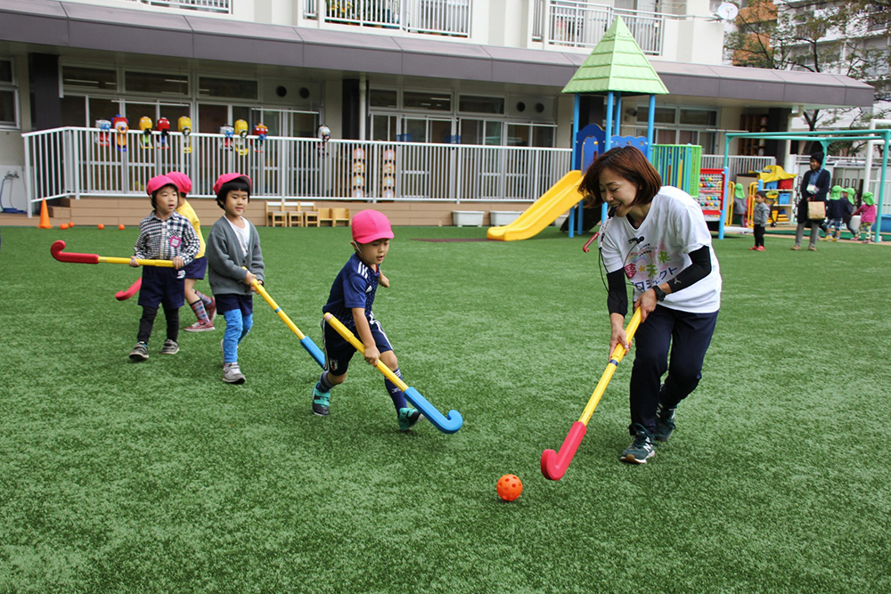 八潮わかば幼稚園で夢・未来プロジェクト 元ホッケー日本代表の藤尾香織さんとホッケー体験