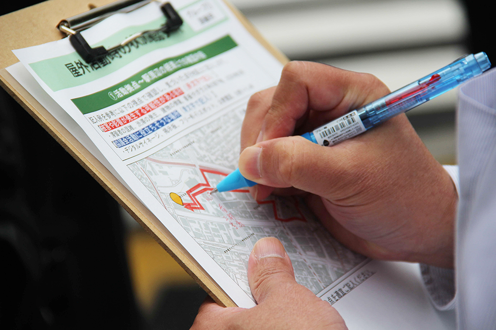 情報収集班では、最初にデジタル移動通信機やタブレットを使用し、本部へ被害情報の伝達訓練を行いました。その後、五反田駅周辺を危険箇所、人が滞留する可能性のある場所などを地図にチェックしながら確認しました。