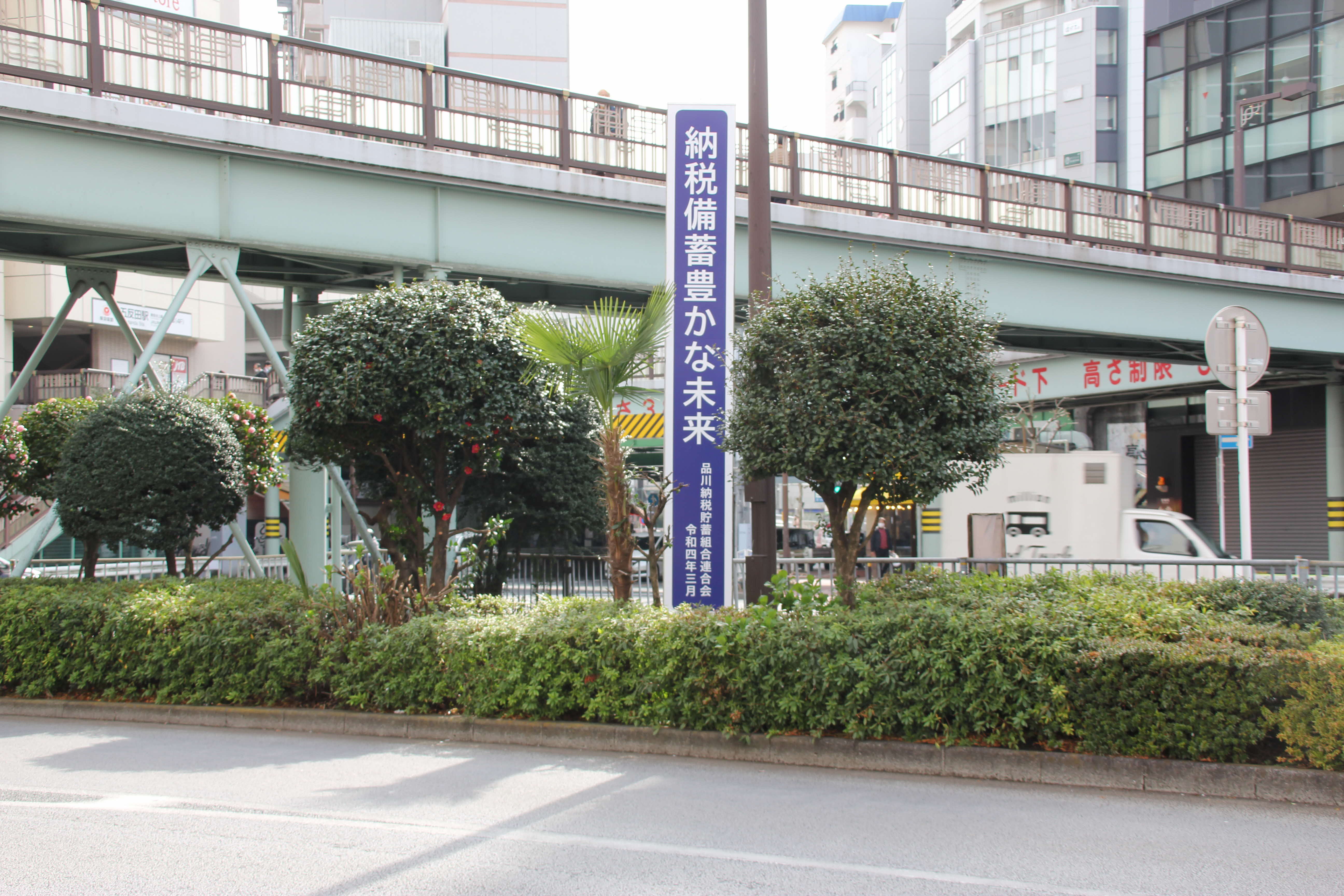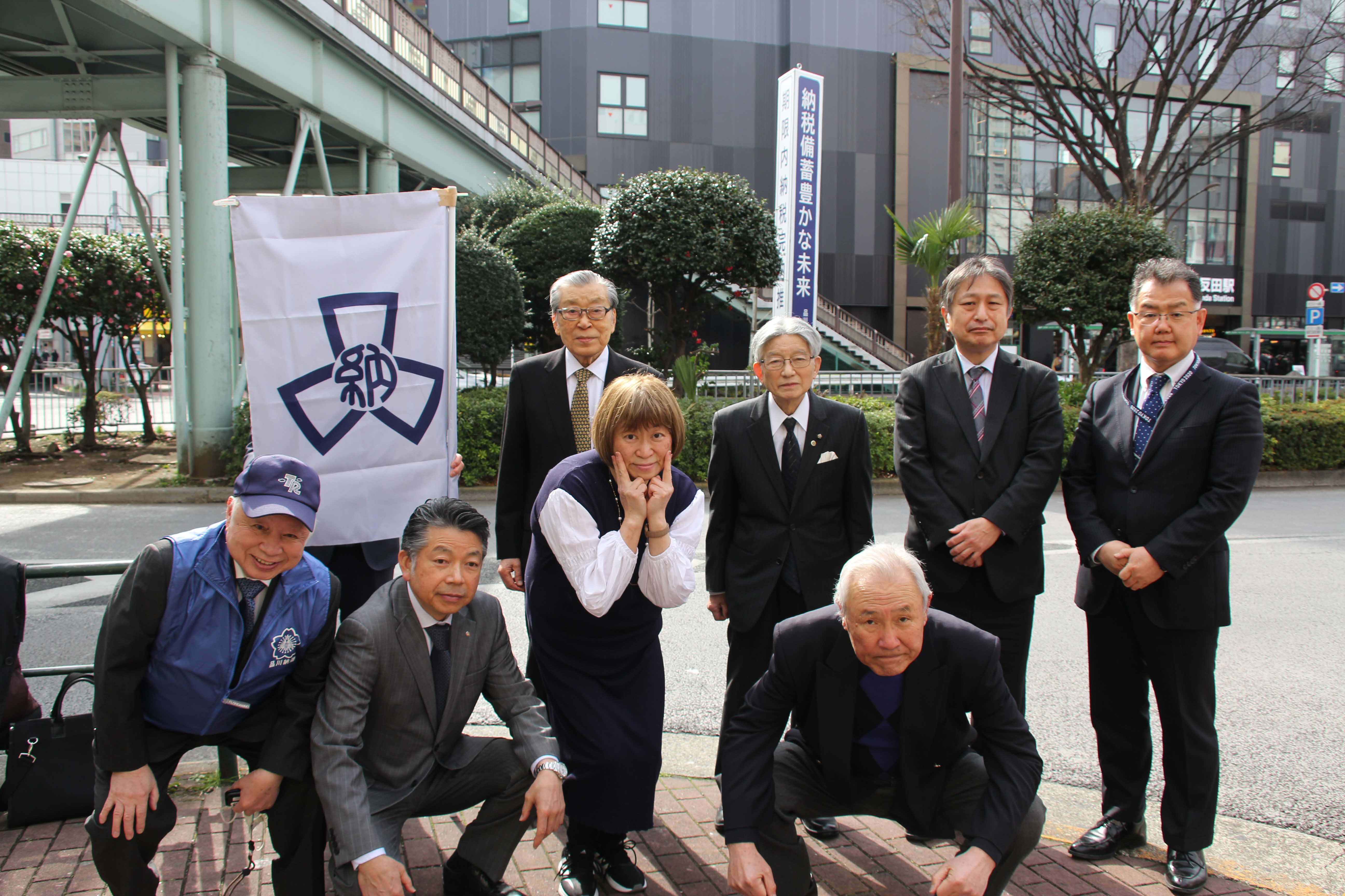 五反田駅東口バスロータリーで令和4年3月23日(水)、品川納税貯蓄組合連合会「標識塔完成式」が行われました。