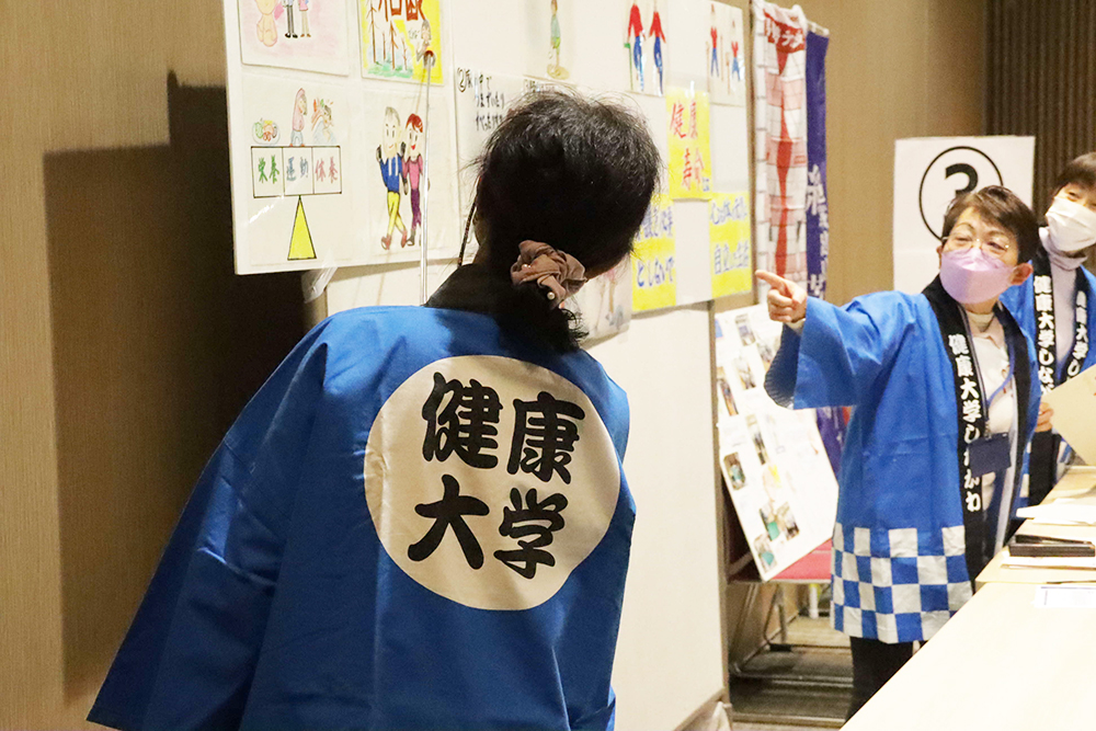 健康づくり体験ブースでは、健康大学しながわ地域健康づくりグループが、日常生活ですぐに実践できる健康づくりについてアドバイスしました。「健康紙芝居」「指体操」「しながら体操」「お口の健康づくり」「ウォーキングのこつ」をテーマに、各グループが「健康大学しながわ」で学んだ知識を生かし、さまざまな活動を披露。参加者も一緒に体を動かしていました。