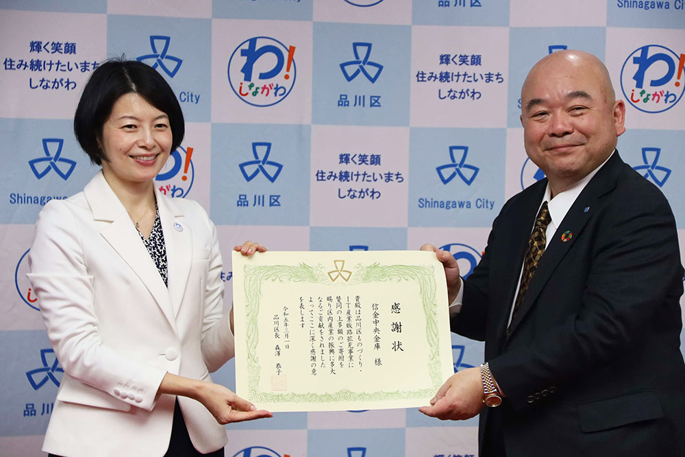 その後、中原副理事長より森澤区長へ目録が手渡され、森澤区長からは感謝状が贈呈されました。森澤区長は「品川区に対して多大なるご寄附をいただき、改めて御礼申し上げます。品川区ものづくり・IT産業販路拡充事業は、区内事業者の販路拡大やネットワークの構築、イノベーションを促し、産業の振興を図るために行っています。新型コロナ対策や物価高騰など、区内事業者にも大きな影響が出ている中で、当事業を通じて城南信用金庫とともに意欲ある区内事業者の新しい展開の後押しを行い、地域経済の活性化に今後も務めてまいります」と感謝を述べました。