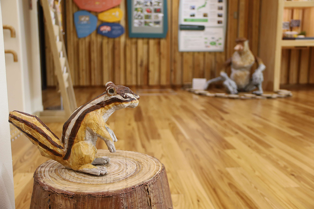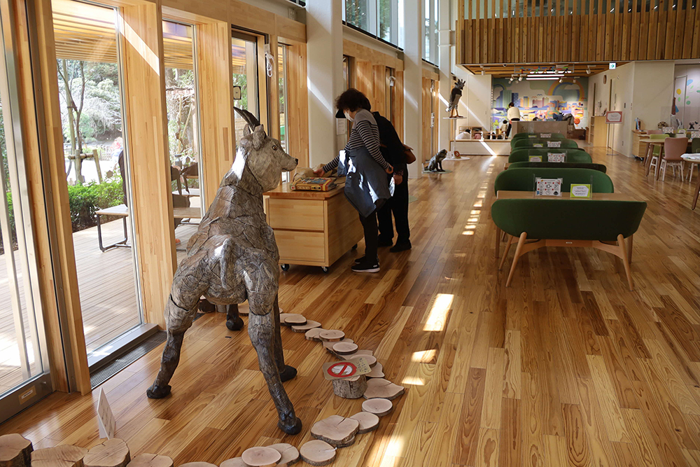 今回、自然豊かな戸越公園内にあるエコルとごしの館内に、チーターやユキヒョウ、マンドリルなど、個性豊かな動物たちを25体展示。木のぬくもりがあふれるエコルとごしの雰囲気に溶け込みながらも、強く主張しているような、不思議な空間を生み出しています。