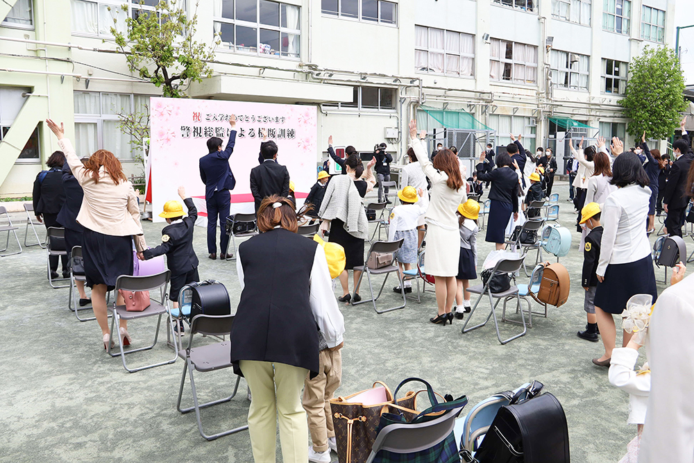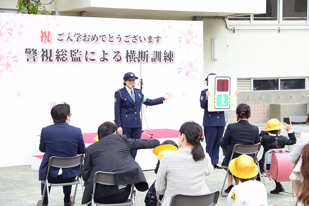 はじめに小島 裕史 警視総監が新1年生に向け、「道路を渡るときは横断歩道を渡ってください。必ず青信号で渡ってください。青信号になっても直ぐに渡らず、右・左・もう一度右を見て車が来ていないかを確認してから渡ってください」と、道路を渡るときの心得を指導。また保護者へは「子どもと一緒に通学路を実際に歩いて危険な場所を確認し、安全に通学できるように子どもに教えてください。自転車に乗るときはヘルメットをかぶる習慣を親子でつけてください」と訴えかけました。