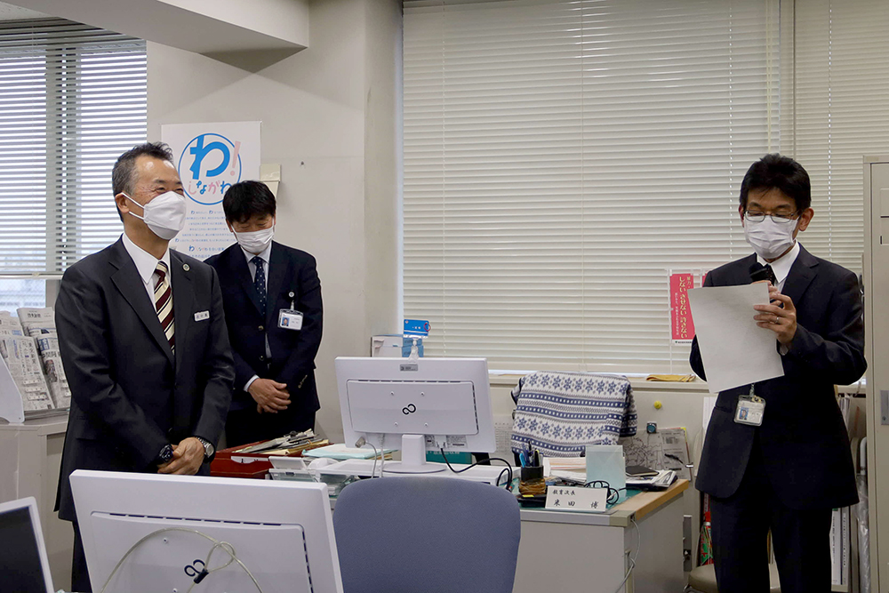 その後、教育委員会事務局執務室で、事務局の職員や駆け付けたOB・OGを含めた学校関係者などに対し、「学校の子どもたちに対するさまざまな取り組みと、教育委員会事務局の支援、この2つがうまく絡み合い、今の品川区の教育が成り立っています。手を携えてくれた、ここにいる皆さんに改めてお礼を申し上げます。これからは、新しい体制の中で、新しい時代の品川区の教育をつくっていくことになります。品川区や各学校の今後を心から楽しみにしています。品川の教育に光あれ!」とあいさつすると、執務室は万雷の拍手で包まれました。