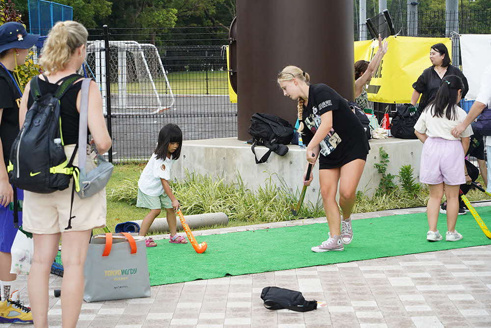 これは品川区を拠点としている東京ヴェルディ女子ホッケーチームの日本リーグの試合に合わせて、競技場の周辺を活用し、「しながわホッケー地域応援プロジェクト」として、ホッケーのさらなる周知と振興を図ることが目的の企画です。また、環境に優しい取り組みについて考えるきっかけとして、区が実施している「打ち水大作戦しながわ2023」の一環として、試合前に打ち水イベントも行いました。(6日はゲリラ豪雨のため打ち水イベントは中止)