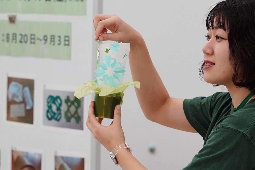 参加者は土台となる白い紙を、コピー用紙、トレーシングペーパー、和紙のなかから選び、ハサミやのりを上手に使いながら、切り絵のようにしたり、紙を丸めてみたり、短い時間のなかで夢中になって制作。飾り用の紙は、公園の自然に溶け込むようにさまざまな緑色が用意され、参加者は自由な発想で色の多様性を楽しみながら、個性豊かな作品を完成させました。