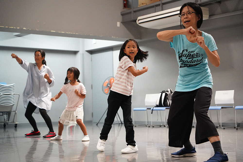 続いて、パンチ・キック・ガードの基本を指導。次に教わった技を組み合わせた、格闘技とはちがったお芝居用のアクションを親子で身体を動かしながら学びました。ワークショップの最後は、習ったことを取り入れたアクションシーンのお芝居を披露。親子で息の合ったアクションシーンを演じて、ワークショップは無事終了。参加の記念にインスタントカメラで撮影した劇団員との集合写真を持ち帰りました。