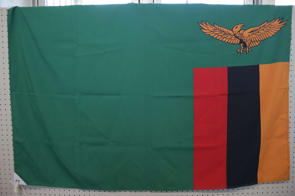 今回は、廊下の両側にザンビア共和国の国旗を展示。ザンビア共和国の国旗は、大自然を象徴する緑地に、自由を勝ち取るための闘争を表す赤、国民を表す黒、天然・鉱物資源を表すオレンジ色のラインが右下に、右上には国民の力を象徴している国鳥のフィッシュ・イーグルが描かれています。