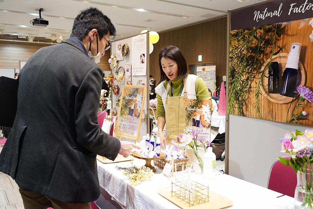 今年は手作り商品・サービスをテーマに起業家のタマゴ20組と先輩起業家4組、地域の飲食店が参加し、ブースではそれぞれが自身のキャリアや子育て経験等を活かしたグッズやサービスを出店。また、体験コーナーやステージイベント、ワークショップなども実施しました。